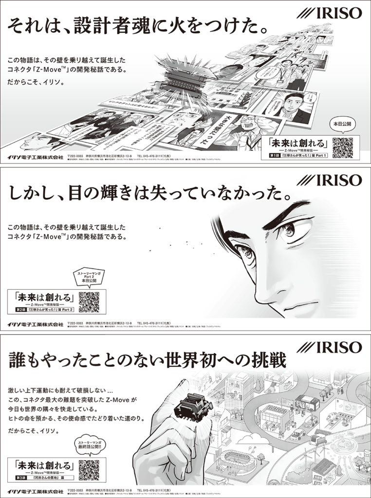 現在WEBサイトにおいて、クルマの電動化を飛躍的に加速させたイリソ独自の技術「Z-Moveコネクタ」の開発秘話をわかりやすく紹介したオリジナルマンガを公開中ですが、これに登場するマンガの印象的なシーンを効果的に使用し、みなさまにマンガサイトにアクセス頂きたいとの思いがこめられています。