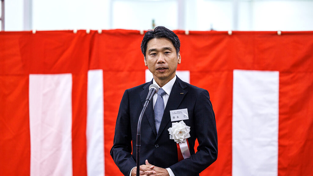 午前10時から実施された竣工式には、会⻑の佐藤定雄、社⻑の鈴⽊ 仁、取締役専務執⾏役員である武田佳司ら弊社幹部をはじめ、来賓の佐⽵敬久秋⽥県知事、髙橋⼤横⼿市⻑ら総勢約40人の関係者が参加致しました。