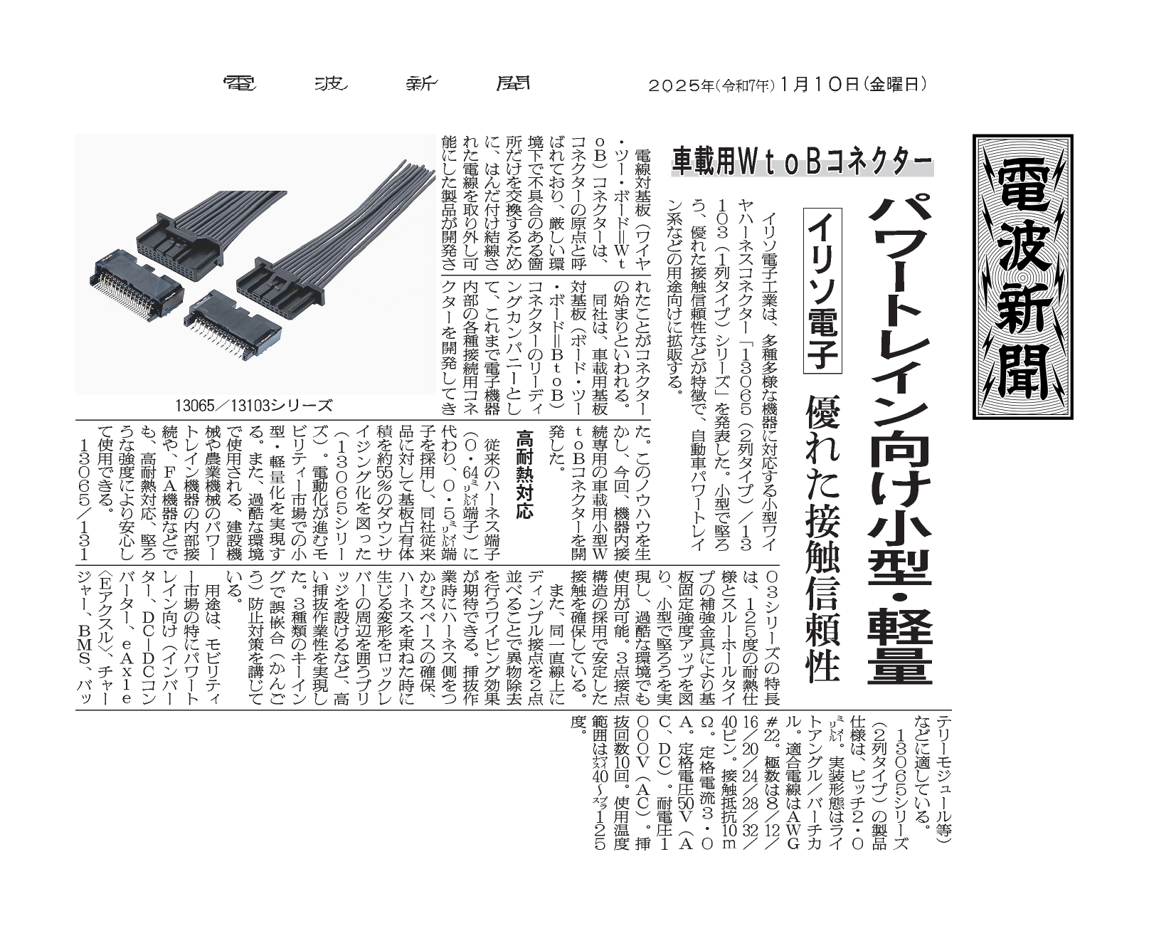 パワートレイン向けワイヤーハーネスコネクタ「13065(2列タイプ)/13103(1列タイプ)シリーズ」を発表した件が紹介されています。