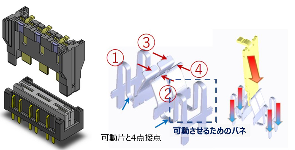 10122B/Sシリーズにおいては可動片を分岐させることでフローティングの動きを妨げずに低抵抗化を実現、加えて4点接点構造で信頼性を向上させた高耐熱(125℃定格)コネクタです。可動が必要な基板間接続におけるパワー伝送用に魅力的な選択肢であるとのご評価をいただき、多くのお客様に採用いただいております。