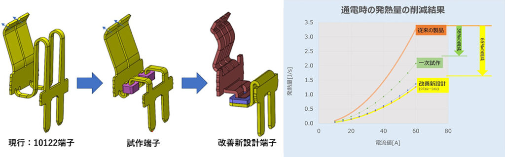 サンプルの作成と評価を実施したところ、10122の端子を流用しての初回の試作品では高電流通電時の熱発生量の4割近くが削減できました。