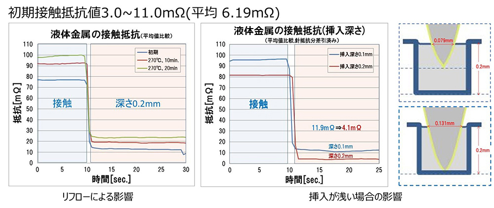 コネクタとして製品化するためには、各々の部位の要求に併せて、金属が個体である部分と液体である部分を使い分けることが必要となりそうです。すなわち液体金属と他の個体金属を組み合わせる=接触という形でのマッチングが課題となります。