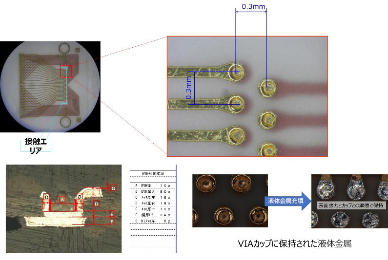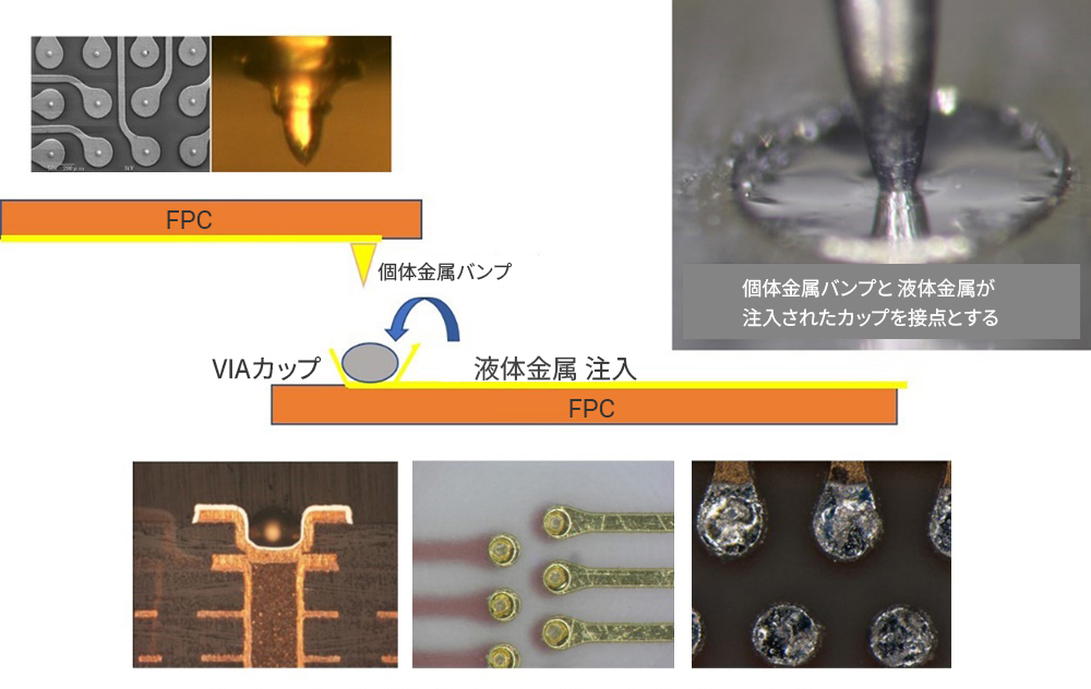 具体的には個体金属でバンプを形成したオス側のフィルムに対して、VIAカップに充填した液体金属を表面張力で維持することでメス側のフィルムを作り、絆創膏のようなコネクタ接続を実現させようとするものです。