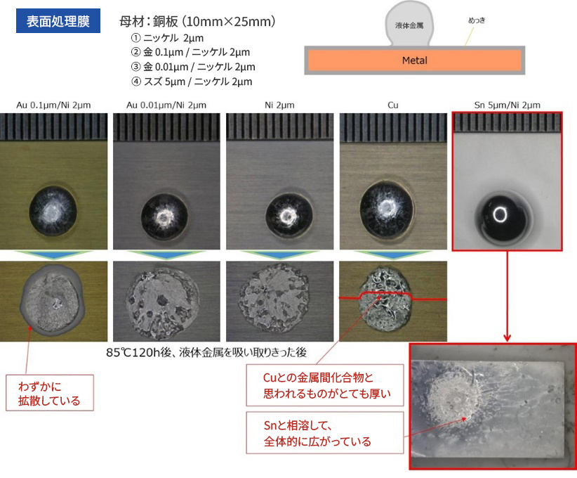 下記は銅板に各種めっき処理を施したものに液体金属を付着させ、高温放置して