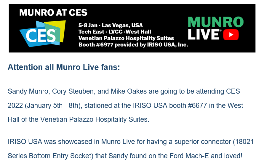 サンディがFord Mach-Eで見つけて気に入った優れたコネクタ(18021 Series Bottom Entry Socket)を、Munro Liveで紹介したことが縁で今回のイベントが実現できました。