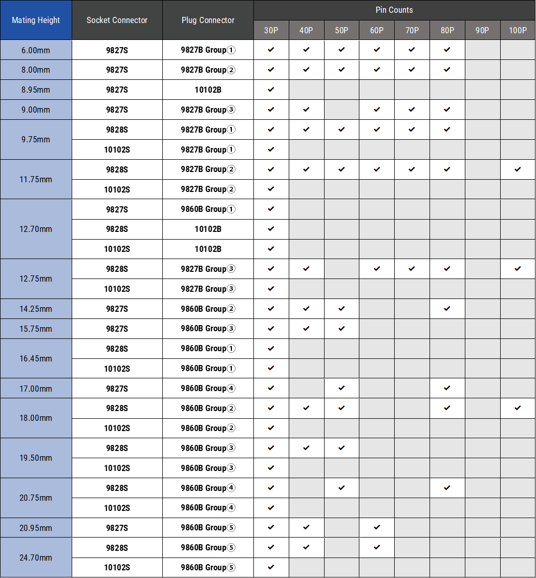 3シリーズの可動域を持ったソケットコネクタおよび4シリーズの固定プラグコネクタから構成されます。各シリーズ内では、製品高さやその他のオプションによって、さらにいくつかのタイプに部類されます。