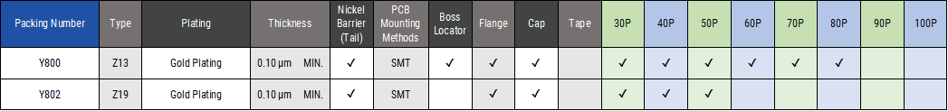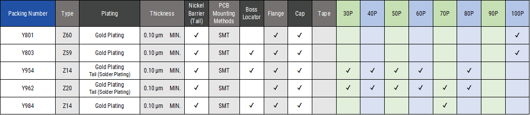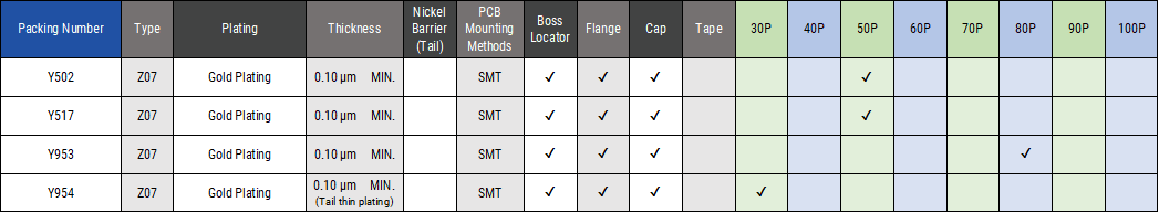 ・各シリーズの仕様(本体高さ、めっき、基板実装方法、参考図面等)を掲載しています。