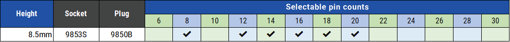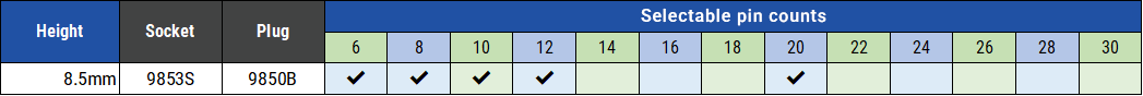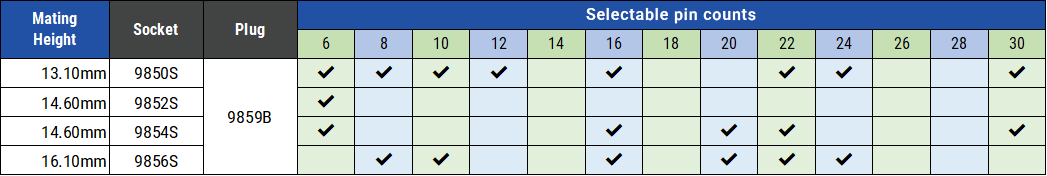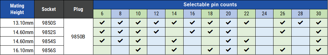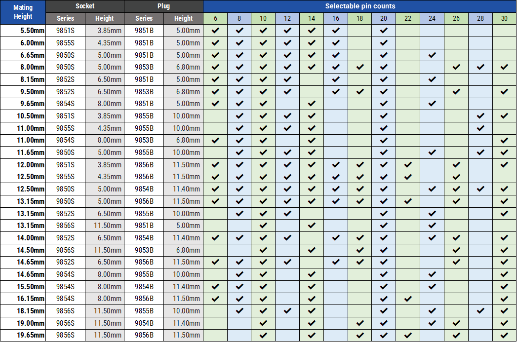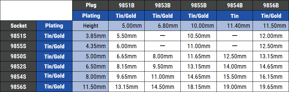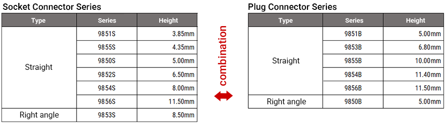 ・ 一番低背な9851S/Bを基準に、別シリーズのソケット・プラグを組み合わせることで基板間距離を調整できます。