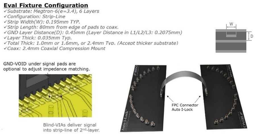 一方で、お客様自身でのシミュレーション等に対応するため、製品のピュアな特性を評価する別のテストフィクチュアも製造し、「基板実装部(SMT )→コネクタ→線材→コネクタ→基板実装部」までのSパラメータ の抽出を行い、お客様にご提供しています。(数に限りがございますが、お客様への基板の貸し出しも実施しています/30極品対応。お問い合わせフォームから 、もしくは弊社営業員にお問い合わせください。)。