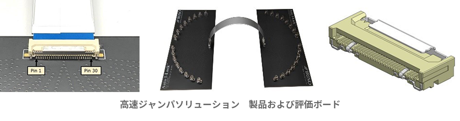 そこで、「基板以外の伝送路で高速伝送分のみを避難させる」ことで、より安価で信頼性の高い高速伝送ソリューションをご提供できるはずであると、その伝送路の中でもFPC(フレキシブルプリンテッドサーキット)や FFC(フレキシブルフラットケーブル)と呼ばれる配線材とイリソ電子工業のコネクタを組み合わせて開発したものが、今回ご紹介する「高速ジャンパソリューション」です。
